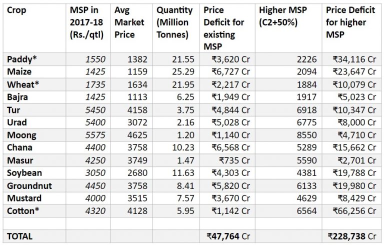 So, if the government were to bear the entire cost of the price deficit suffered by the farmers for these 13 crops in 2017-18, the bill comes to Rs 47,764 crore. If you add the remaining 10 minor crops, the bill would have been about Rs 50,000 crore. This is smaller than the MGNREGA budget of that year. The actual government expenditure would be smaller, because market intervention and legal provisions would raise market price and reduce the amount to be paid by the government.